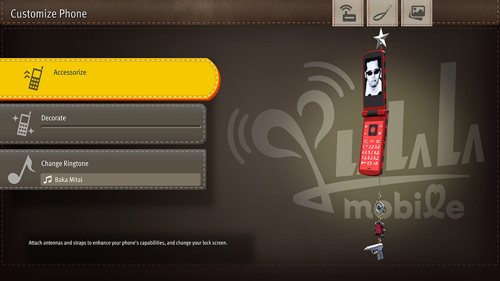 You can personalize Kiryu's flip phone by adding straps, swapping out the antenna, and changing the lock screen. As each part comes with a unique effect that boosts Kiryu's abilities, there are tons of combinations to try out. Rhinestones and stickers are also available as decorations, so feel free to style it your way!