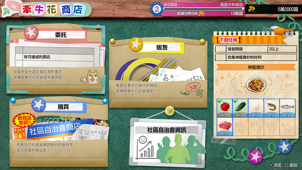 在牽牛花生活時獲得的蔬菜和手工藝品等道具,可以透過牽牛花商店賣給社區自治會的成員,藉此賺取資金。
