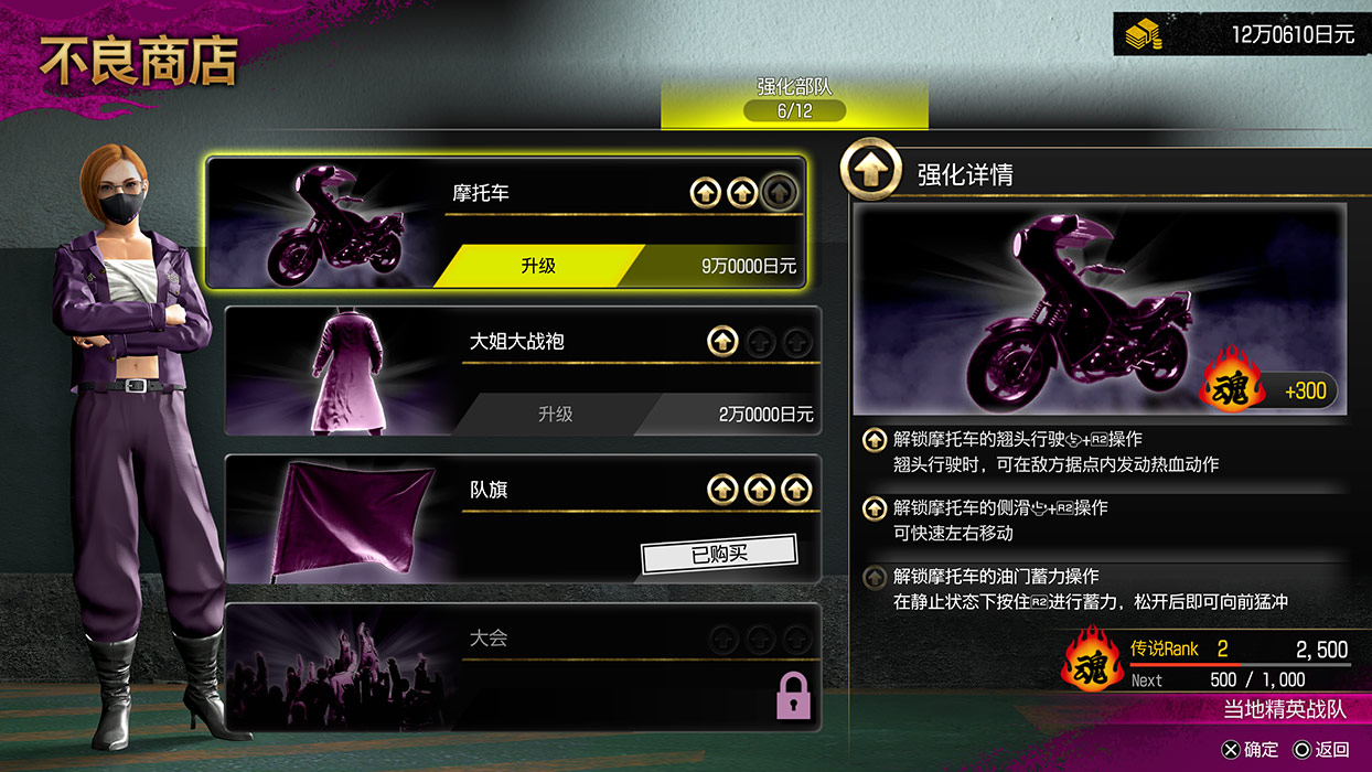 升级摩托车或大姐大战袍,不仅能让外观变得更加华丽,还能解锁新的技能。