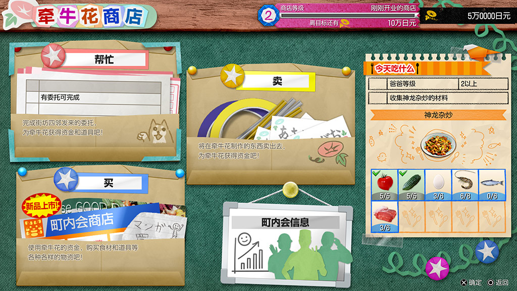 在牵牛花商店,可以将平时在牵牛花获得的蔬菜和手工艺品等交付给町内会的人们,赚取资金。