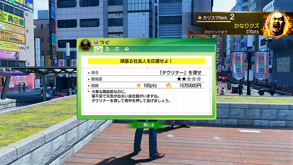 カタギレスキューはその名の通り、街中で困っているカタギの人々を助けることで神田の評判を上げていくミッションだ。