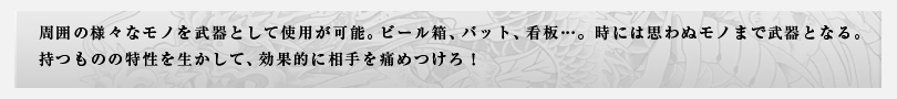 「ラッシュブロウ」から更に、殴り下ろす、腹への悶絶の一撃、 そして突き上げる一撃など、強力な「フィニッシュブロウ」の一撃を 繰り出すことができる。これらを喰らった者は、もはや立っていられないだろう。
