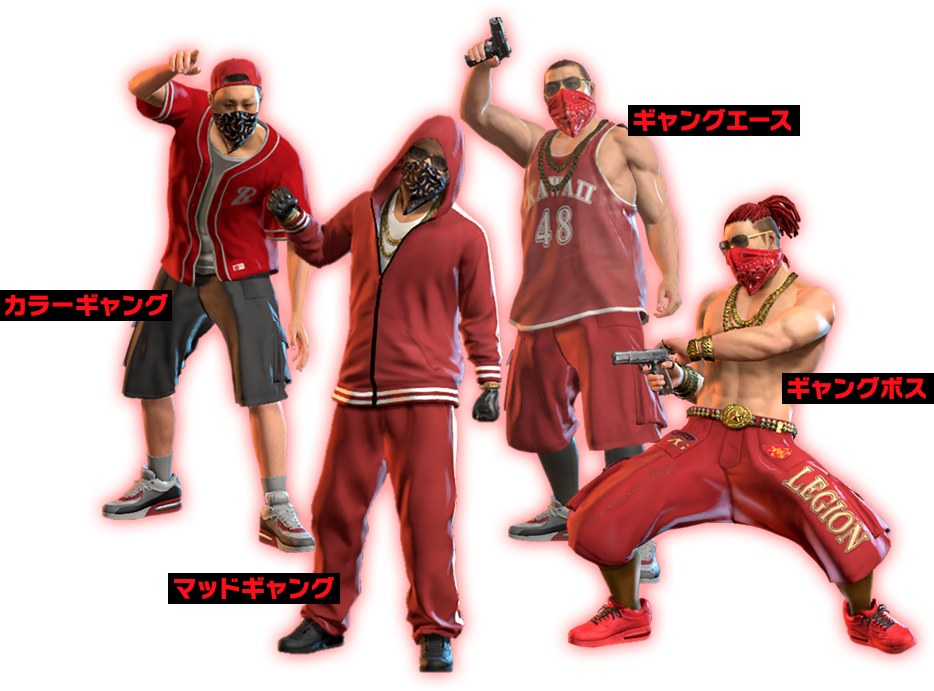 下位2種(カラーギャング、マッドギャング)は拳で攻撃を仕掛けてくるだけだが、上位2種(ギャングエース、ギャングボス)は拳銃を容赦なく発砲してくる強敵。銃撃は防御できない危険な攻撃なので、見かけるようになったら装備と回復アイテムを買いそろえておこう。