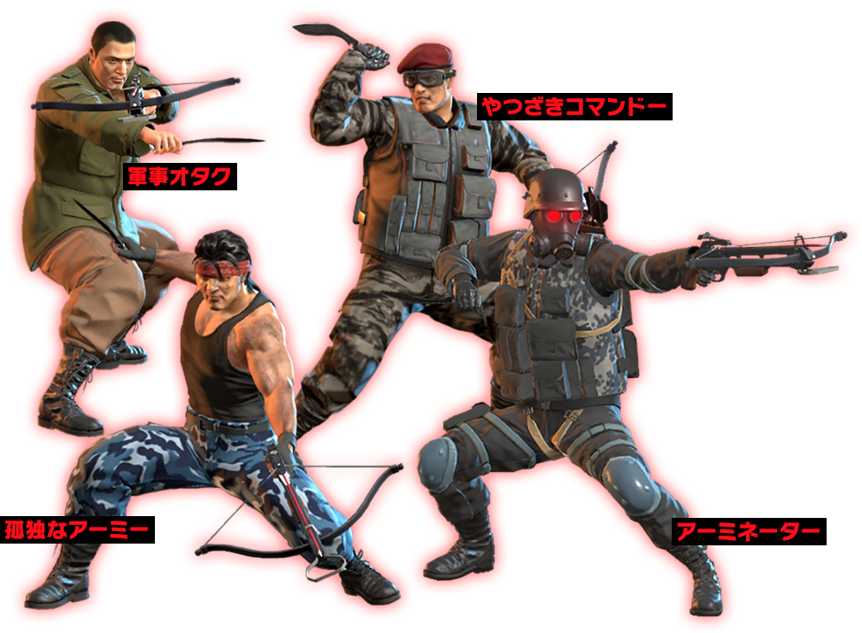 グレードが上がるにつれてナイフの斬撃、手榴弾の爆撃、ボウガンの連射といった、武器を用いた技を駆使してくる。最上位のアーミネーターにもなると、「破壊光線」というビームを目から発射する。人間なのかどうかすら謎に包まれた敵だ。